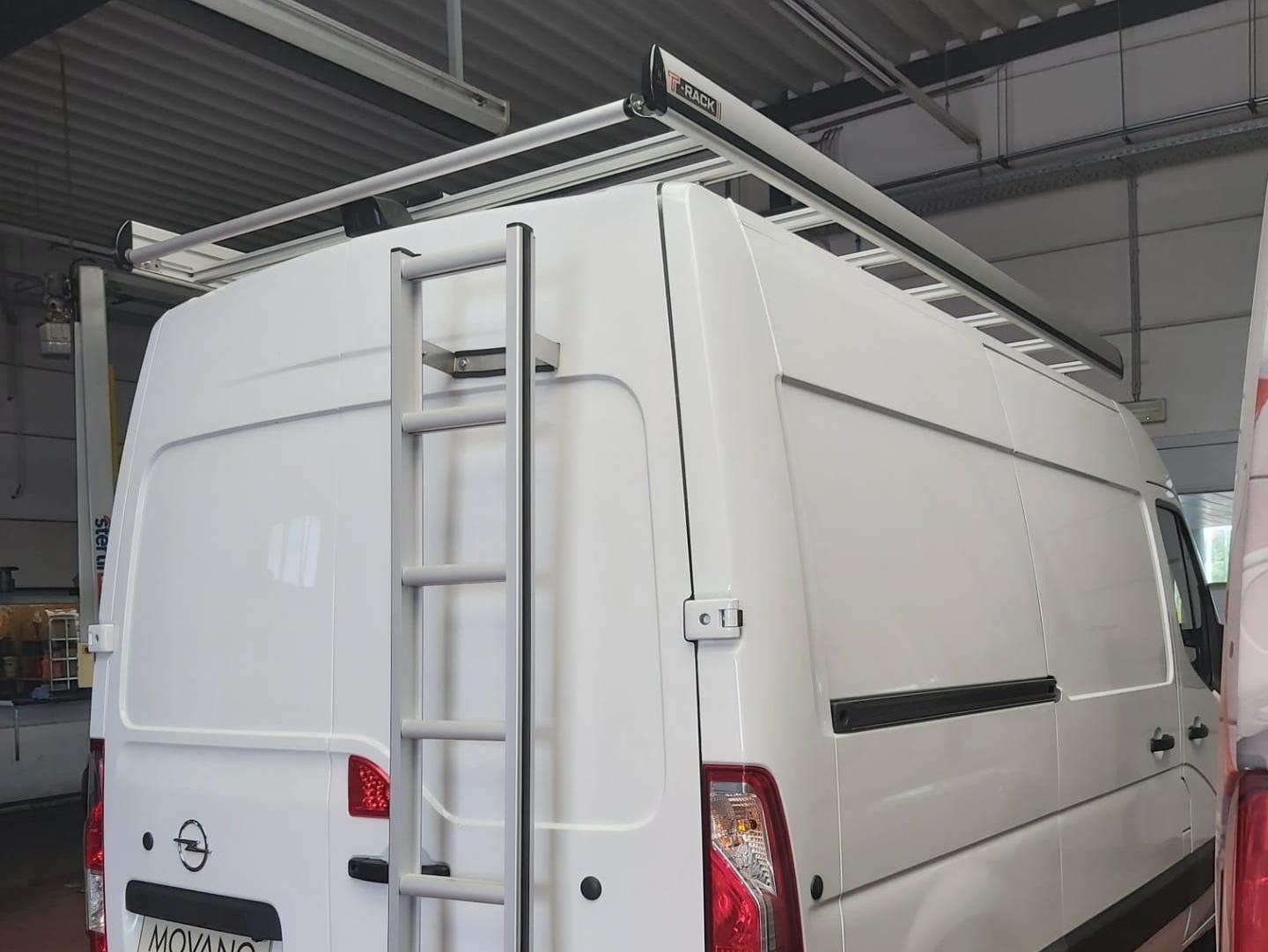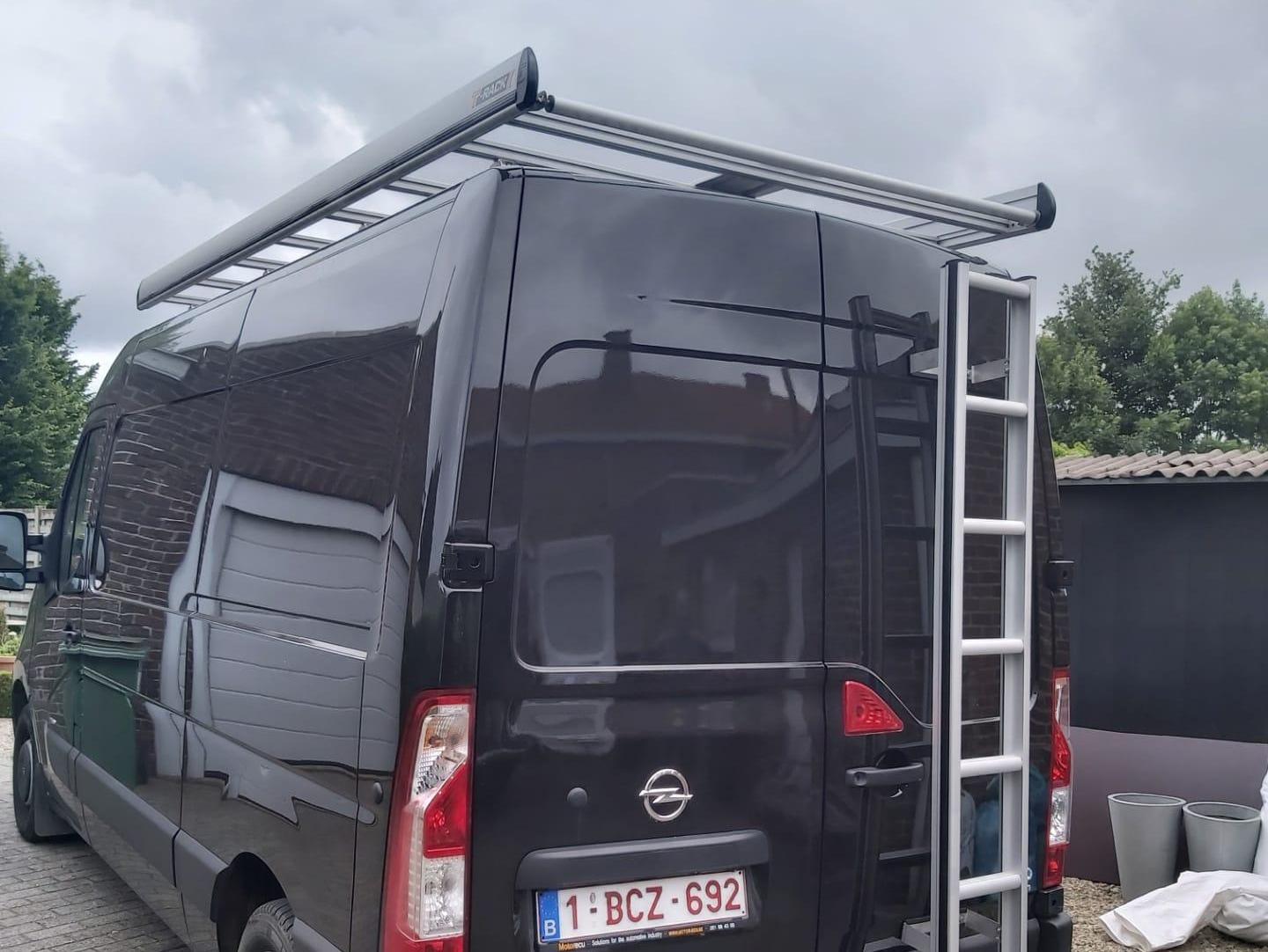 En plus de la galerie de toit, une échelle a également été montée sur la porte arrière de l'Opel Movano. Avec cette échelle, notre client peut facilement atteindre sa galerie de toit et effectuer son travail.